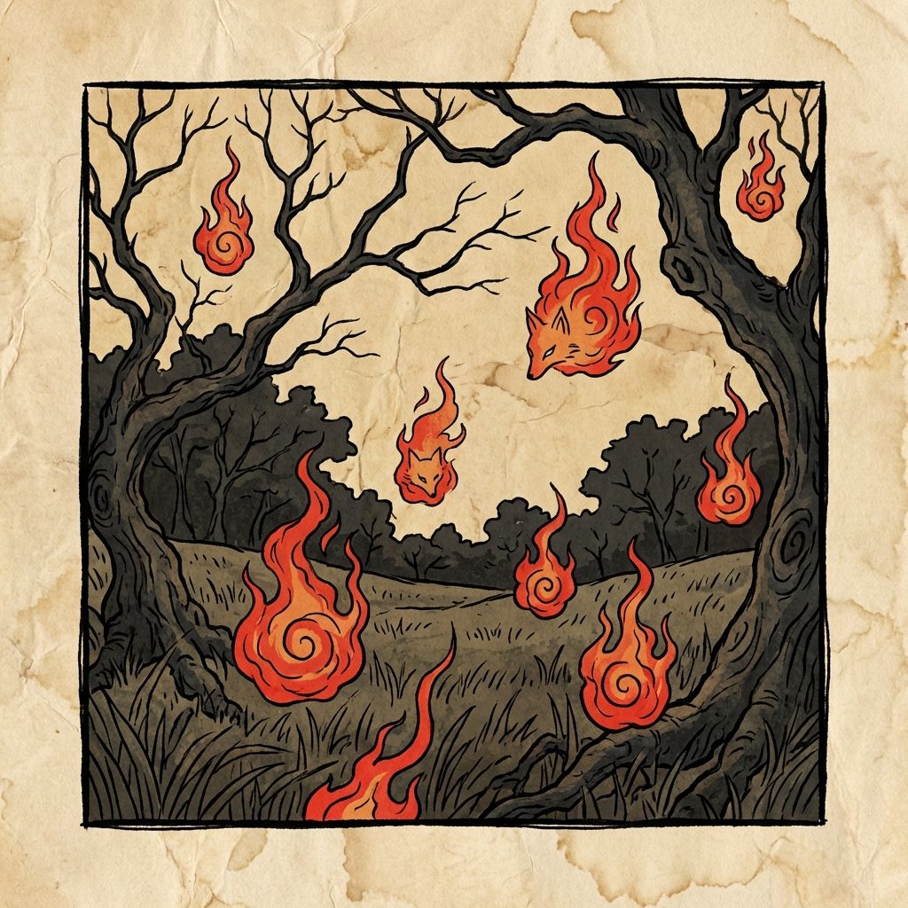 BEHAVIOR: Kitsunebi gather to mimic wedding processions of foxes. They lead travelers astray into deep forests. The fireballs dance erratically to confuse onlookers. These spirits vanish instantly if someone gets too close.